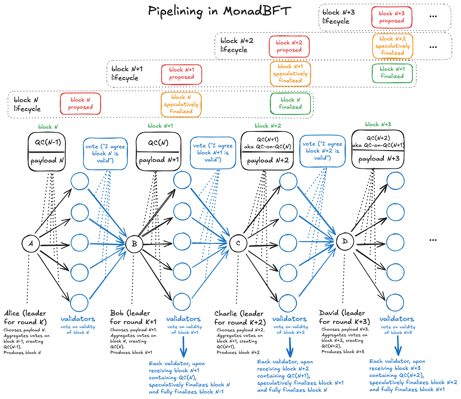 This sequential process delays block finalization. MonadBFT only requires 2 phases, which makes finality faster, but also, it uses a pipelined approach, overlapping phases: when block k is proposed, block k–1 is voted on, and block k–2 is finalized simultaneously. This parallelism reduces latency.