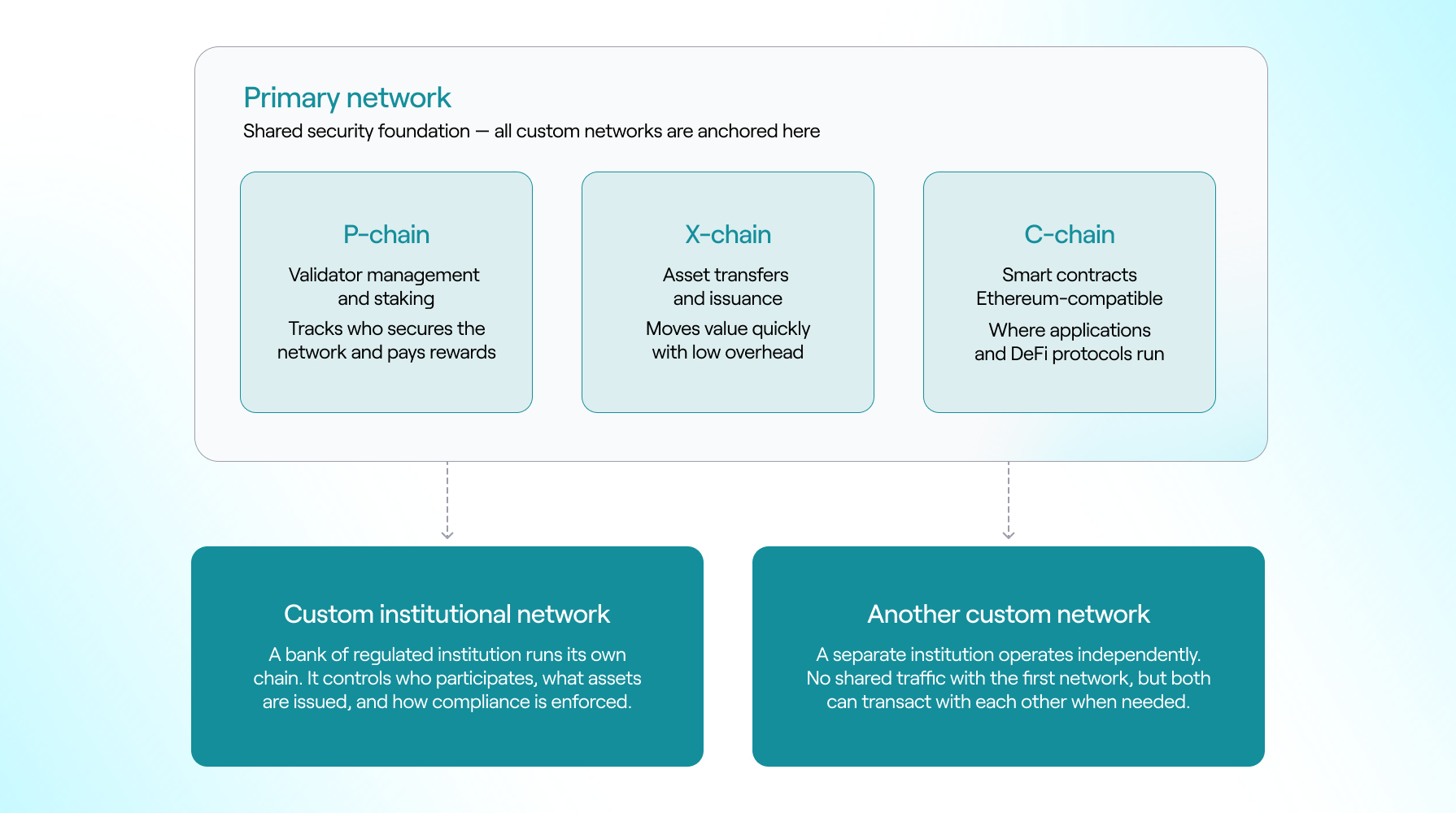 Avalanche is not a single blockchain. It has a primary network at its core containing three specialised chains, each built for a specific job. On top of that foundation, institutions can launch their own custom networks (Avalanche L1s) with their own rules, their own participants, and their own compliance logic.