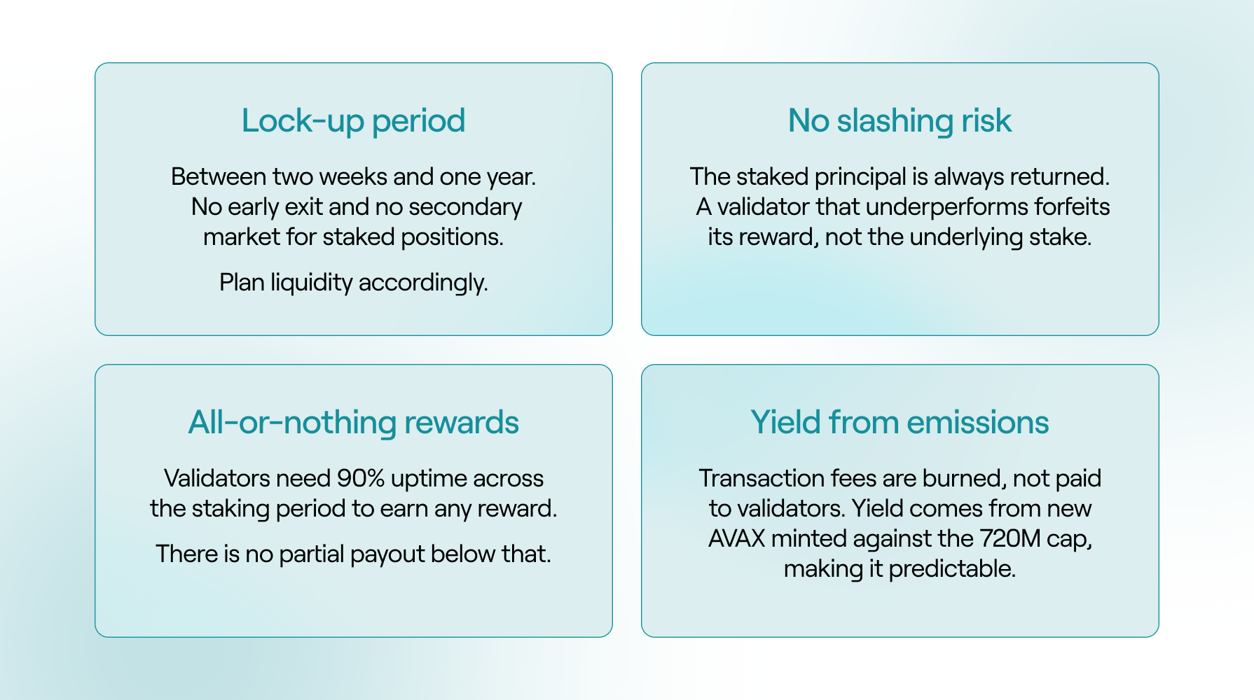 The lock-up structure is the most important consideration for institutional clients. Staking durations on Avalanche range from a minimum of 2 weeks to a maximum of 1 year, and any duration within that window can be selected at the point of staking. Once committed, the position cannot be exited early and the parameters cannot be changed. The chosen duration should align with the client's liquidity planning accordingly.