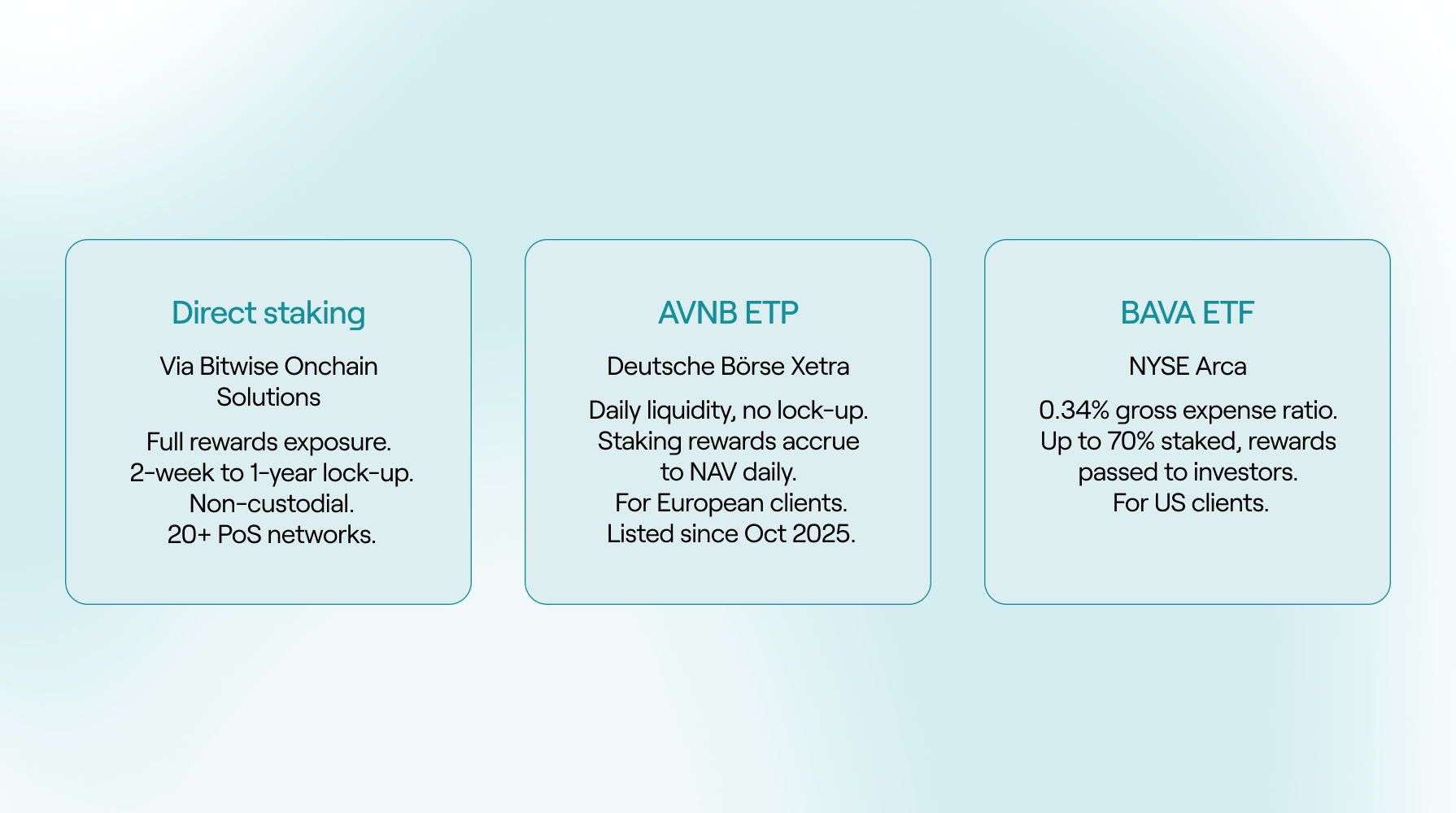Direct staking suits clients who hold AVAX and want full rewards exposure through dedicated infrastructure. Bitwise Onchain Solutions operates validators across more than 20 proof-of-stake networks and manages the full technical stack: uptime monitoring, reward collection, and reporting. The client retains ownership of the underlying tokens throughout.